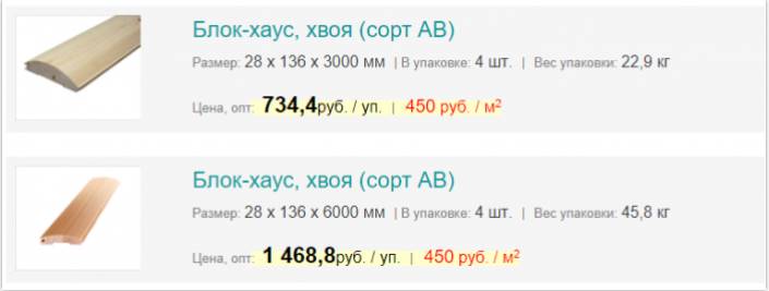 - Блок хаус – вагонка, имитирующая сруб (скругленная поверхность). Средняя стоимость 1 м² из сосны 300-750 руб. Если использовать лиственницу, то цена возрастает приблизительно в 2,5 раза.
