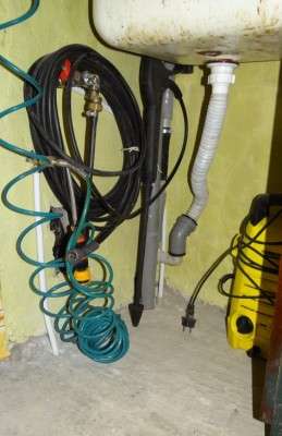Вода с насоса поступает на верх и через шланг подается на керхер. Найденная мойка как нельзя кстати подошла в эту конструкцию… слив подключен к трубе перелива (та которая выходит на улицу)